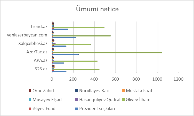 Şəkildən də göründüyü kimi, monitorinq dövründə monitorinqə cəlb olunmuş mediada ən çox İlham Əliyevlə bağlı informasiyalar paylaşılmışdı. Belə ki, bu dövr ərzində AzərTac İA-da İlham Əliyevlə bağlı 1043, “Yeni Azərbaycan” qəzetində 554, trend.az-da 495, “525-ci qəzet”də 448, Apa.az-da 429 və “Xalq Cəbhəsi” qəzetində 365 informasiya paylaşılıb.